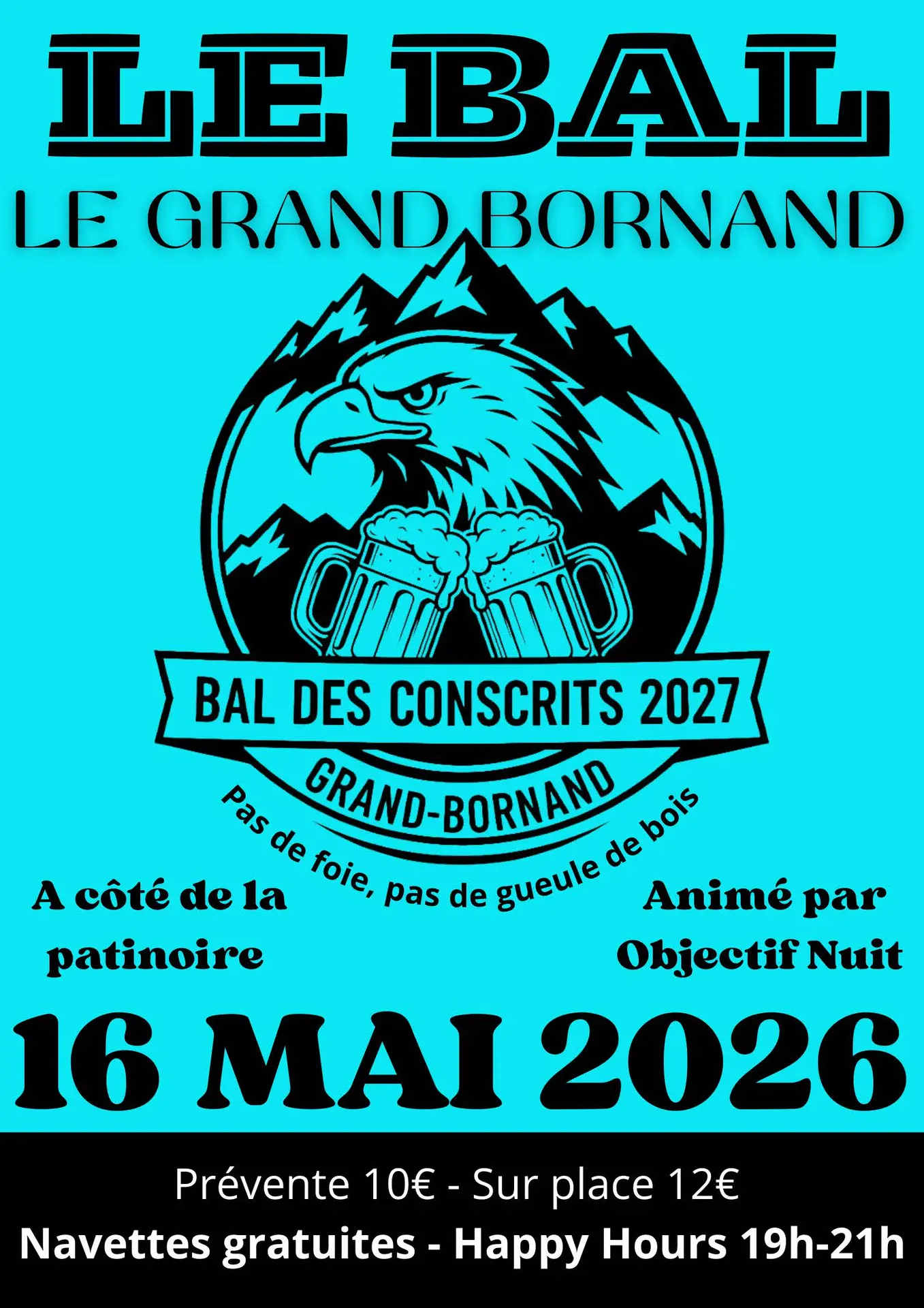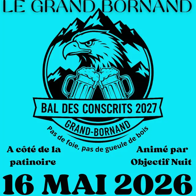 Bal des conscrits de la classe 2027. Soirée animé par Objectif nuit. Happy hour de 19h à 21h. Petite restauration sur place (saucisses, frites, hot-dog). Navettes gratuites au retour à partir de 1h.