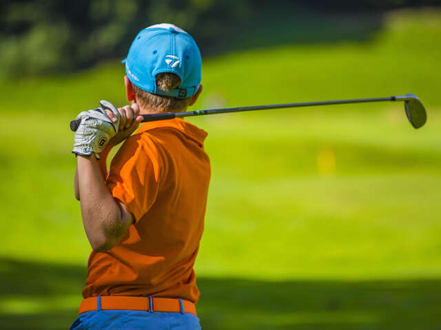Golf Le Rocher Blanc au Grand-Bornand. Une famille composée d'une femme, d'un homme et d'un enfant passe un agréable moment au golf, ils se tiennent par l'épaule, batte en main.Découvrez toutes les informations utiles : Brochures, infos pratiques, programme cinéma, programme d’animations, plans…